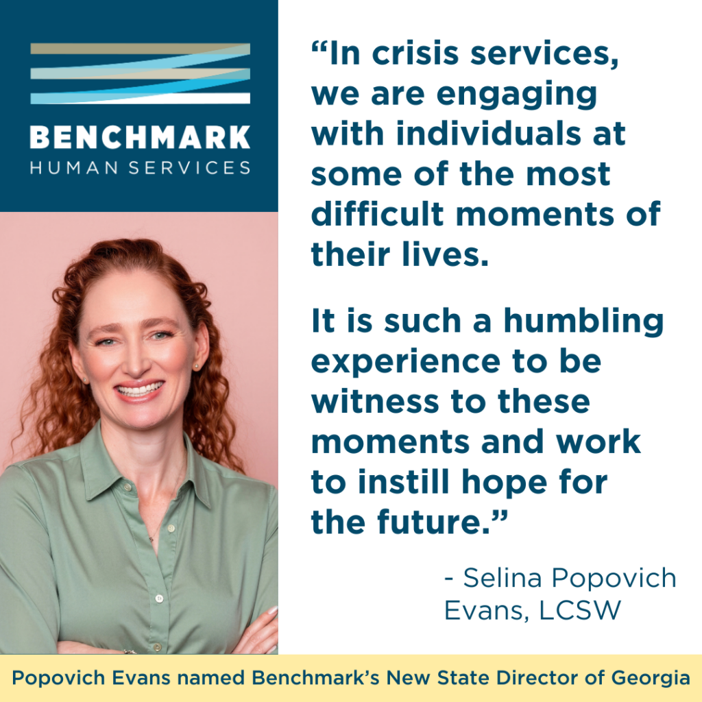 Selina Popovich Evans, LCSW, was recently promoted to serve as Benchmark Human Services’ (Benchmark’s) Georgia State Director of Crisis Services. Popovich Evans will oversee Benchmark’s mobile crisis response services (MCRS), which operate in Regions 1, 4, 5, and 6 of Georgia, as well as our nine short-term crisis homes and two transitional care homes.